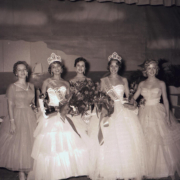 Scene from the 1956 Miss Kingsport-Miss Sullivan County Pageant. From left to right, Judy Kibler Weatherford (Miss Kingsport 1955), Barbara Jo Ketron (Miss Sullivan County 1955), Sharon Kay Rithie (Miss America 1956), unidentified, and unidentified.