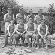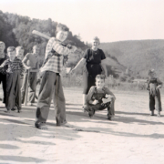 Mrs. Hickey of the Sullivan County Tuberculosis Association stands in the background as Jack Dorsey is at bat. To the right is J.C. Telfer. Mrs. Hickey conducted a TB program for area schools in a crusade against Tuberculosis.
