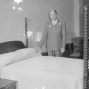 The bedroom department at Homeland Furniture and Appliances. Homeland was located at 110 East Center Street. The company’s president, secretary, and treasurer were Flem Dobyns, Guy Culbertson, and George W. Taylor.