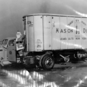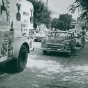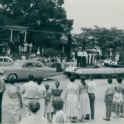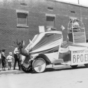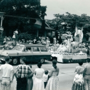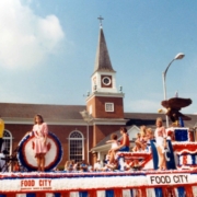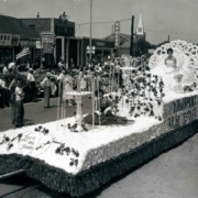 Fourth of July parade float sponsored by the Kingsport Real Estate Board. In the background is Armour Drug Store and Kroger.