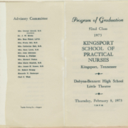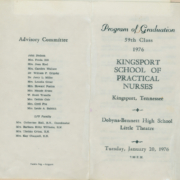 The Kingsport School for Practical Nurses Collection contains an informational scrapbook and miscellaneous photographs from the Kingsport School for Practical Nurses. The program began in 1947 and the scrapbook starts with that year. Among the photographs are class pictures and programs from the graduating classes. There is also a file of miscellaneous newspaper clippings concerning […]