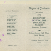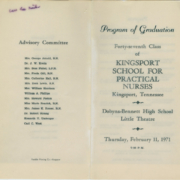 The Kingsport School for Practical Nurses Collection contains an informational scrapbook and miscellaneous photographs from the Kingsport School for Practical Nurses. The program began in 1947 and the scrapbook starts with that year. Among the photographs are class pictures and programs from the graduating classes. There is also a file of miscellaneous newspaper clippings concerning […]
