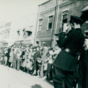 A photo of a parade along Broad Street. Part of the Strand Theatre can be seen in the background.