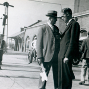 Unidentified men standing in front of the Clinchfield Railroad Station on Main Street. The man on the left appears to be holding a giant key that says Kingsport.