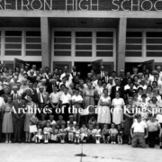 A group poses on the steps of Ketron High School in the Bloomingdale Community. The technical name of the school is Joseph H. Ketron Memorial High School. It was named after Ketron, who was born in 1837 in the Arcadia community and became a teacher. The school now operates as Ketron Intermediate School.
