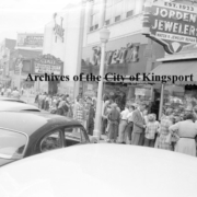Line of people in front of the State Theatre. Other busineess in the image are Bower’s, Jorden’s Jewelers.