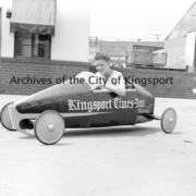 Unidentified boy in a soap box derby car sponsored by Kingsport Times News.