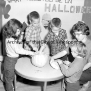 Children in the St. Paul’s Kindergarten Class decorating a pumpkin for Halloween.