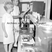 Miss Alley and unidentified man in a laboratory at Holston Valley Community Hospital.