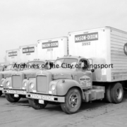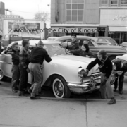 Boys washing cars on Broad Street for a March of Dimes fundraiser. Businesses in the image include Fuller and Hillman and Morgan’s Shoes.