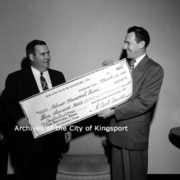 John Dudney (left) president of the Kiwanis Club, presents a check to an unidentified man for the Palmer Memorial Fund.
