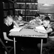 Jimmy Frazier, Bobby Moore, Raymond Smith, and Lowell Craft in the library of the Boys Club.