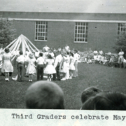 Third graders circling the May Day pole at Lincoln Elementary School. Although May Day is not celebrated as widely today, the activity was once very popular. The pole would have been decorated with brightly colored ribbon and streamers.