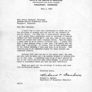 KINGSPORT CITY SCHOOLS OFFICE OF THE DIRECTOR OF INSTRUCTION DOBYNS-BENNETT HIGH SCHOOL BUILDING KINGSPORT, TENNESSEE June 3, 1960 Miss Evelyn Sandusky, Principal Abraham Lincoln Elementary School Kingsport, Tennessee Dear Miss Sandusky: I would like to take this opportunity to thank you for the privilege of working with you and all the teachers in Lincoln School. […]