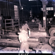 Men at work inside Slip-Not Belting Corporation. H. Jefferson Shivell was President and Treasurer of the industrial belt manufacturing company; J.D. Cox Jr. and M. Gladstone Starnes were vice presidents; Mrs. Genevieve Shivell was the secretary. The plant was located at 432-38 East Main Street.