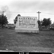 Sign advertising a baseball game between Cherokee and Blueville. The game was a fund raiser to help finish the Teen Center. A Dodge sedan, groceries, season tickets, and other prizes were given away.
