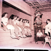 A man in a nurse’s office having his throat looked at. The photograph was taken for Borden Mills and this may be the nurse’s office at the plant.