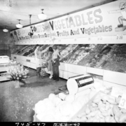 A Cut Rate Super Market Employee assists shoppers in the Fruits and Vegetables section. The store was located at 440 East Sullivan Street; Henry T. Helton and Thomas La Guardia Jr. were the store owners.