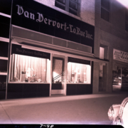 Exterior view of Van Dervort-La Rue Inc. Clarence La Rue managed the shoe store where women could get “Ahead at the Foot.” The shop was located at 111 Broad Street. The building located on the image’s right was a pawn shop called Uncle Sam Loan Office.
