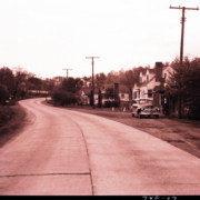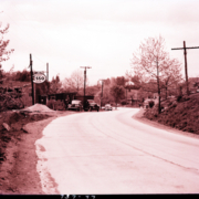View of an unknown rural road. On the left is a business with a sign that reads, “Standard Esso Dealer.” The photograph was taken for Bennett & Edwards Incorporated.