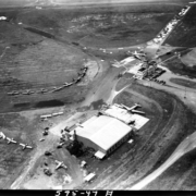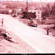 Two men standing beside a rural road. On the right are a building still under construction and a business with a sign that reads, “Standard Esso Dealer.” The photograph was taken for Bennett & Edwards Incorporated.