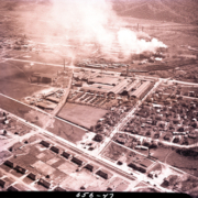 Aerial view of Kingsport Press with Mead Corporation in the background somewhat obscured by smoke.