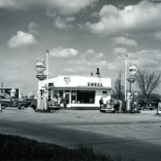 Exterior view of the Bristol Circle Shell Service Station located at 2900 Bristol Highway (now East Center Street) and owned by Stanley Jeter and Jess Lemmons).