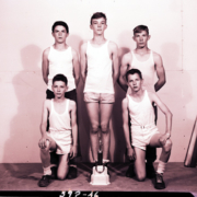 Youth basketball team with trophy. This group of boys was sponsored by W.B. Greene Company.