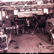 Employees working inside the Mason & Dixon garage. The trucking company was located on Eastman Road. E. Ward King was president and treasurer of the company; Stewart T. King was the vice president; Lloyd W. Pendleton was the secretary; D. Ruth Pickering was the assistant secretary.