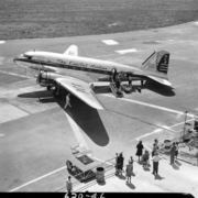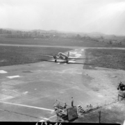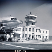 View of plane on Tri-City Airport runway. In the background are large letters on the grass that read, “Tri City Airport, Mc Kellar Field,” and, “Bristol, Kingsport, Johnson City.” Behind the two airport workers is a sign that reads, “Fly PCA, New York, Knoxville, Detroit, Pittsburgh, New Orleans, Chicago, Cleveland, Buffalo, Birmingham.”