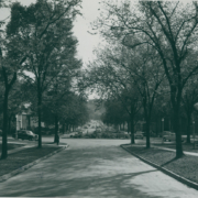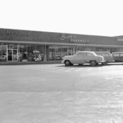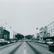 View down Broad Street. Businesses in this image include Diana Shops, Fuller & Hillerman, J.C. Penny’s, Fashion Stop, Jewel Box, First National Bank, Nettie Lee, Freel’s Drug, and Parks-Belk.
