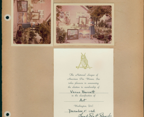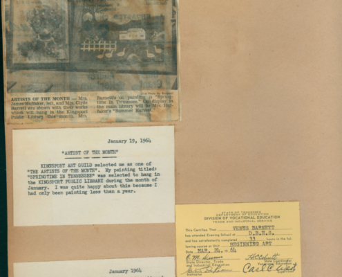 The Venus Barnett Family and Organizations Photographs and Scrapbooks collection contains three scrapbooks and two photo albums created by Kingsport resident Venus Barnett. The scrapbooks detail the early years of her marriage to Clyde Barnett and her involvement in various social groups such as the Woodlawn Garden Club and the Palette and Brush Club later in life. Scrapbooks contain newspaper clippings, photographs, correspondence, and event programs. Also included in the collection are additional newspaper clippings, correspondence, and genealogical material. Folders are arranged alphabetically, and then chronologically.