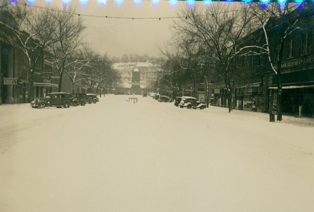 The Mrs. L.P. Gregory collection consists of four photographs taken by Gregory during the winter of 1934-1935. The four images show a snow covered Broad Street in Kingsport, Tennessee. The vantage point was Church Circle.