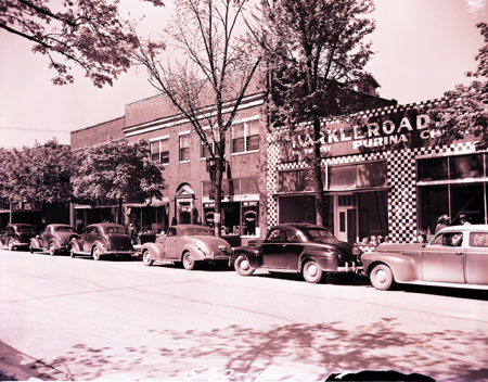 Exterior view of (from right to left) Harkleroad Feed Company, Weaver’s Shoe Shop, Weaver Apartments, and other buildings along East Market Street. Harkleroad Feed Company, located at 122-124 East Market Street, was owned by Robert H. Harkleroad. The store sold feeds, seeds, insecticides, farm machinery, fertilizers, bee and poultry supplies, garden tools, and freezers. Weaver’s Shoe Shop, located at 118 East Market Street, was owned by Ernest A. Weaver. Weaver Apartments were located at 116 1/2 East Marker Street.