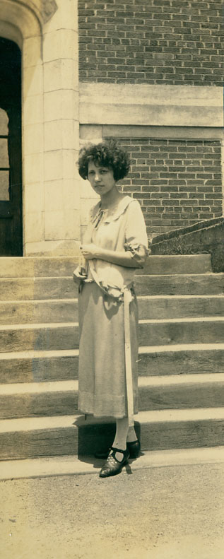 Unidentified woman standing in front of Andrew Jackson Elementary School.