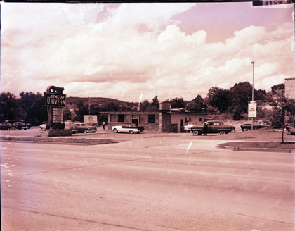 Exterior view of the Beacon Drive-In located at 530 West Center Street. Nelle B. and William P. Major ran the restaurant. Customers could remain in their cars while enjoying milk shakes, hamburgers, sandwiches, and regular dinners. The Beacon’s specialty was hickory flavored Pit Bar-B-Q.