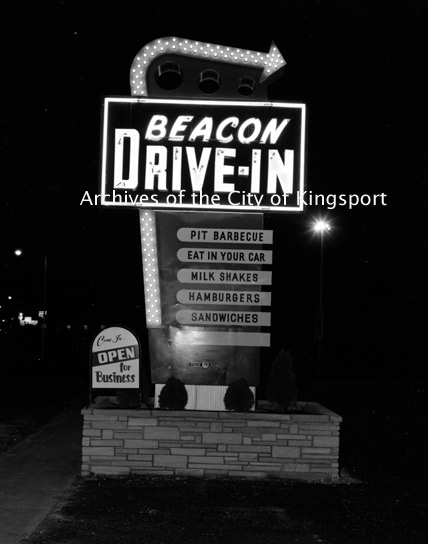 Sign for the Beacon Drive-In located at 530 West Center Street. Customers could remain in their cars while enjoying milk shakes, hamburgers, sandwiches, and regular dinners. The Beacon’s specialty was hickory flavored Pit Bar-B-Q.