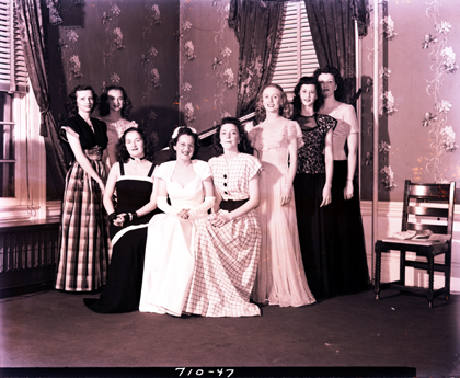 Group portrait of sisters of Beta Sigma Phi in formal dresses. According to the Beta Sigma Phi website, the organization “is an international women’s friendship network. It also provides educational programs to its members and opportunities for service to others. We are women of all ages, interests, and educational and economic backgrounds, and are the largest organization of our kind in the world.”
