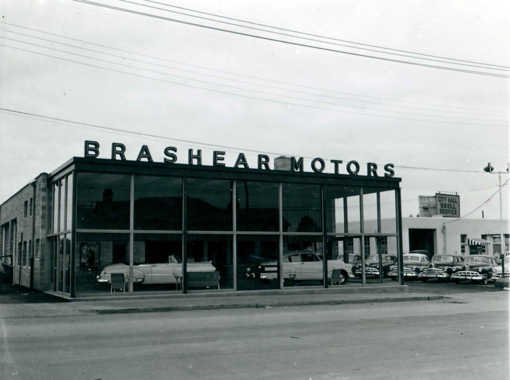 Exterior view of Brashear Motors and City Hall Shell Service.