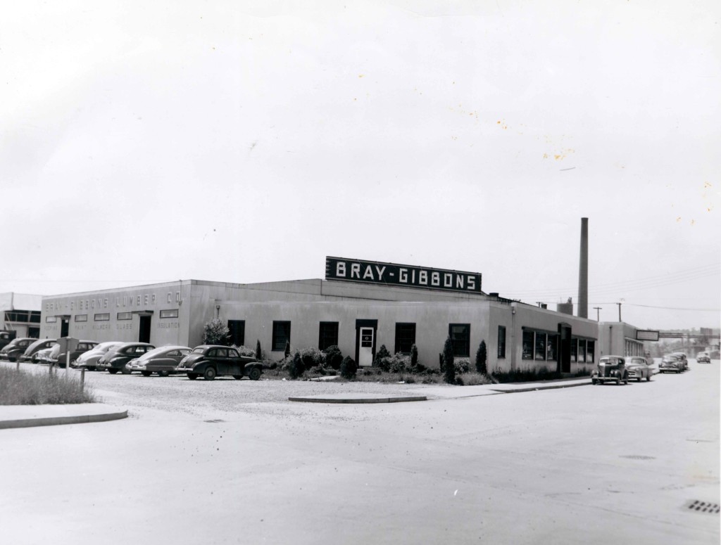 Exterior view of Bray-Gibbons Lumber Co. located at 425 Clinchfield Street. The company provided building and general contractors, materials and supplies, roofing and insulation, and sold lumber, brick, and building hardware.