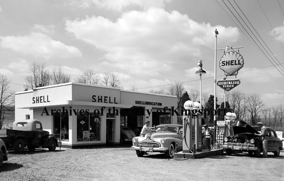 Exterior view of the Bristol Circle Shell Service Station located at 2900 Bristol Highway (now East Center Street) and owned by Stanley Jeter and Jess Lemmons).