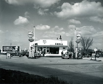 Exterior view of the Bristol Circle Shell Service Station located at 2900 Bristol Highway (now East Center Street) and owned by Stanley Jeter and Jess Lemmons).