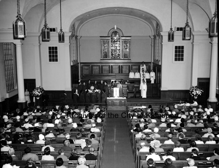 This image shows the interior of the Broad Street Methodist Church during a church service.