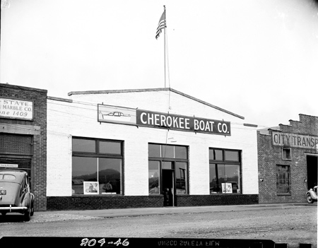 Exterior view of the Cherokee Boat Company located at 327 West Market Street. The building on the image’s right side is the shop for City Transportation Company while the building on the left housed Tri-State Tile & Marble Company.