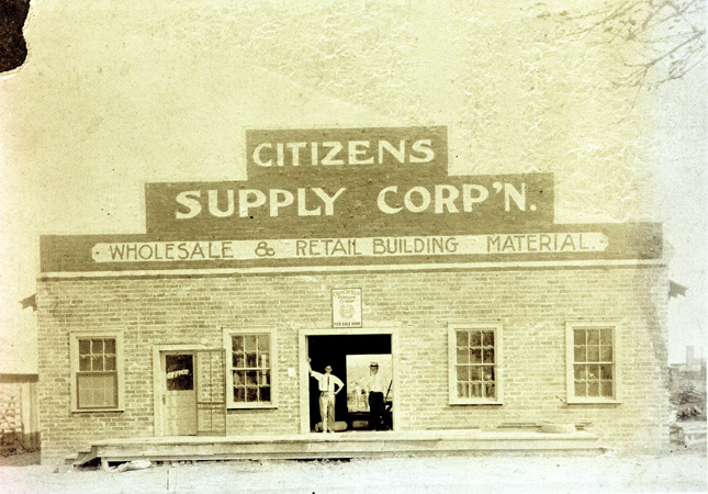 Two men standing in entrance of Citizens Supply Corporation. The company motto was “If it’s to build with we have it.” The date of this image is unknown, but this negative was created in 1952.