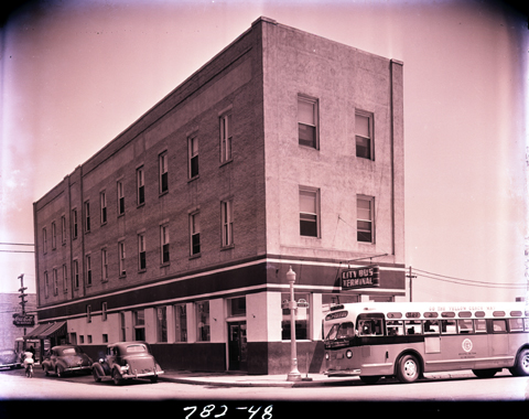 Exterior view of the City Bus Terminal building located at 200 East Main Street. When the picture was taken, Melvin E. Dishner was the manager.