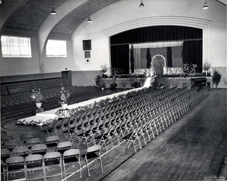 Interior of the Civic Auditorium. The stage is decorated for a fashion show.