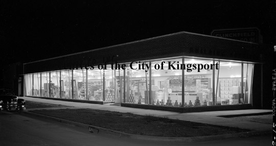 Night view of Clinchfield Supply Company located on East Market Street at the corner of Wexler.
