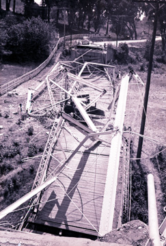 The image shows the collapsed Rotherwood Bridge that crossed the Holston River North Fork and connected Hawkins and Sullivan counties. The structure collapsed on Friday, June 5, 1936. Although the entire western portion of the bridge crumbled, there were no fatalities. Following the accident, traffic was detoured through Weber City, a nine-mile detour.