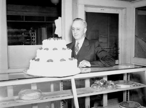 A man stands by a counter with a three-layer cake resting on top. The photograph was taken for the Kingsport Times-News.